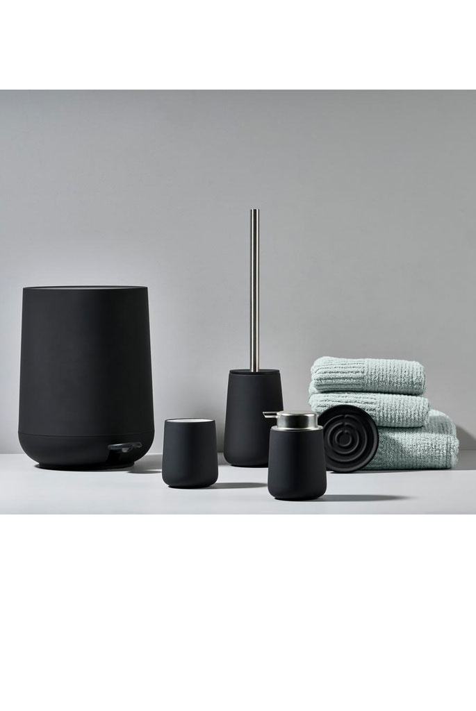 - past perfect bij de badkamer accessoires van Zone Denmark, zoals de pedaalemmer, zeepdispenser en toiletborstel