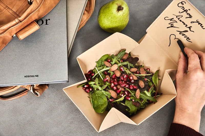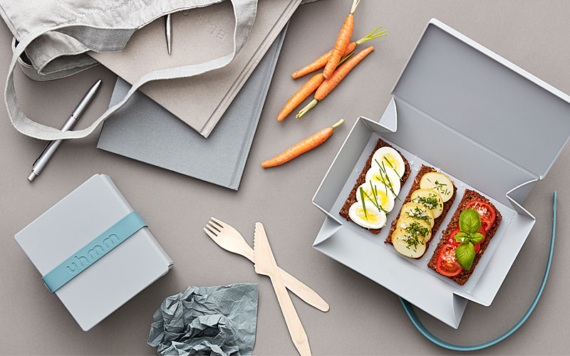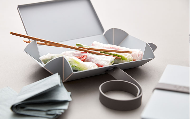 De dochters Lind (van het Deense merk Lind DNA) hebben samen met ontwerpster Anne Qvist de Uhmm box ontwikkeld. Een duurzame kunststof box die je ‘ om je eten vouwt’ zoals al decennia lang in Vietnam gebeurt met palmbladeren. Even eenvoudig als briljant.
