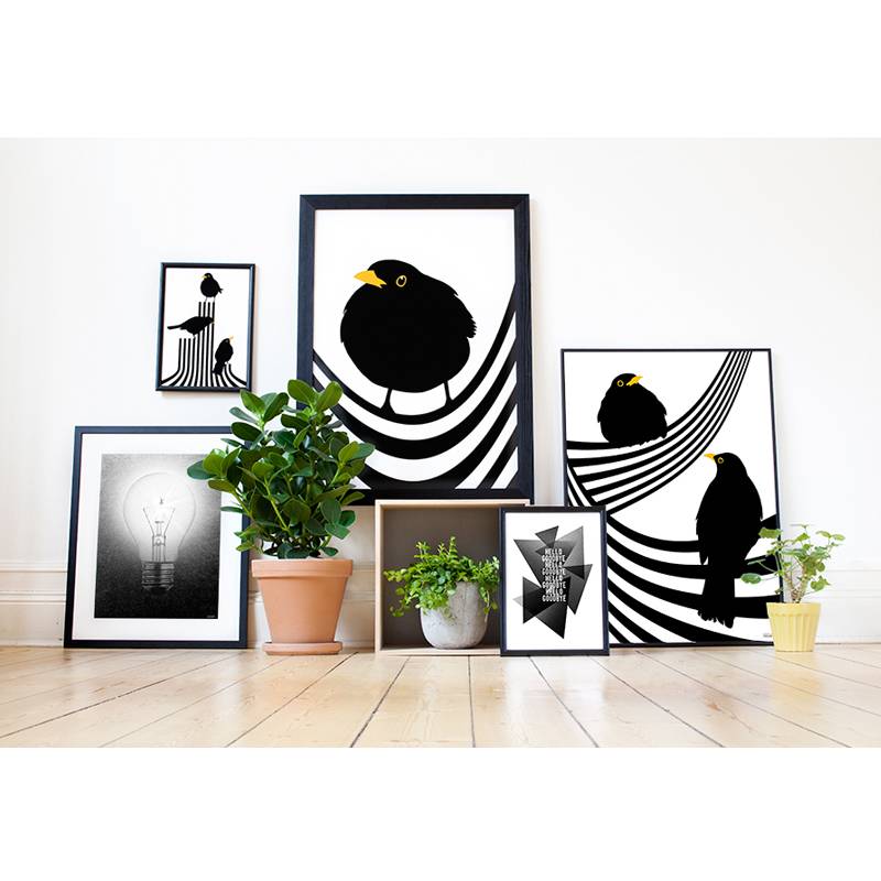 De posters van Lina Johansson Design uit Zweden vallen op door het stevige kleurgebruik. Vaak zwart/wit met lijnen, zoals de merels op een lijn. Of aparte kleuren, zoals de deadline poster.
