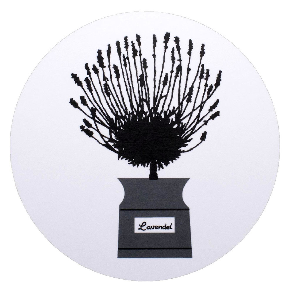 Mooie berkenfineer pannenonderzetter van het Zweedse merk Almedahls. Met zwarte print van een lavendelplant in pot. Voor je hete pannen of schalen.