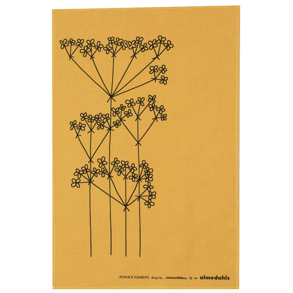 Het prachtige okergeel op de Almedahls theedoek en de afbeelding van dille geven je toch zin om te gaan koken? Misschien zelfs wel een Zweeds gerecht met zalm en veel dille? Lekkere hasselback aardappels erbij, heerlijk!