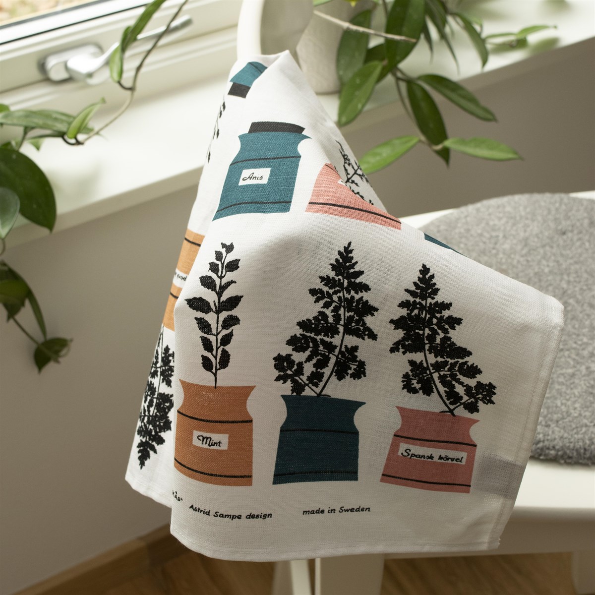 Het ontwerp met de kruidenpotjes dateert al van 1955. Astrid Sampe is een Zweedse ontwerpster die studeerde aan de Swedish State School of Arts en aan het Royal College of Art in Londen. Door Almedahls is het kleurrijke ontwerp nieuw leven in geblazen. De theedoeken passen perfect bij je keuken en lekker koken met allerlei kruiden. Een mooi cadeau voor iedere foody!