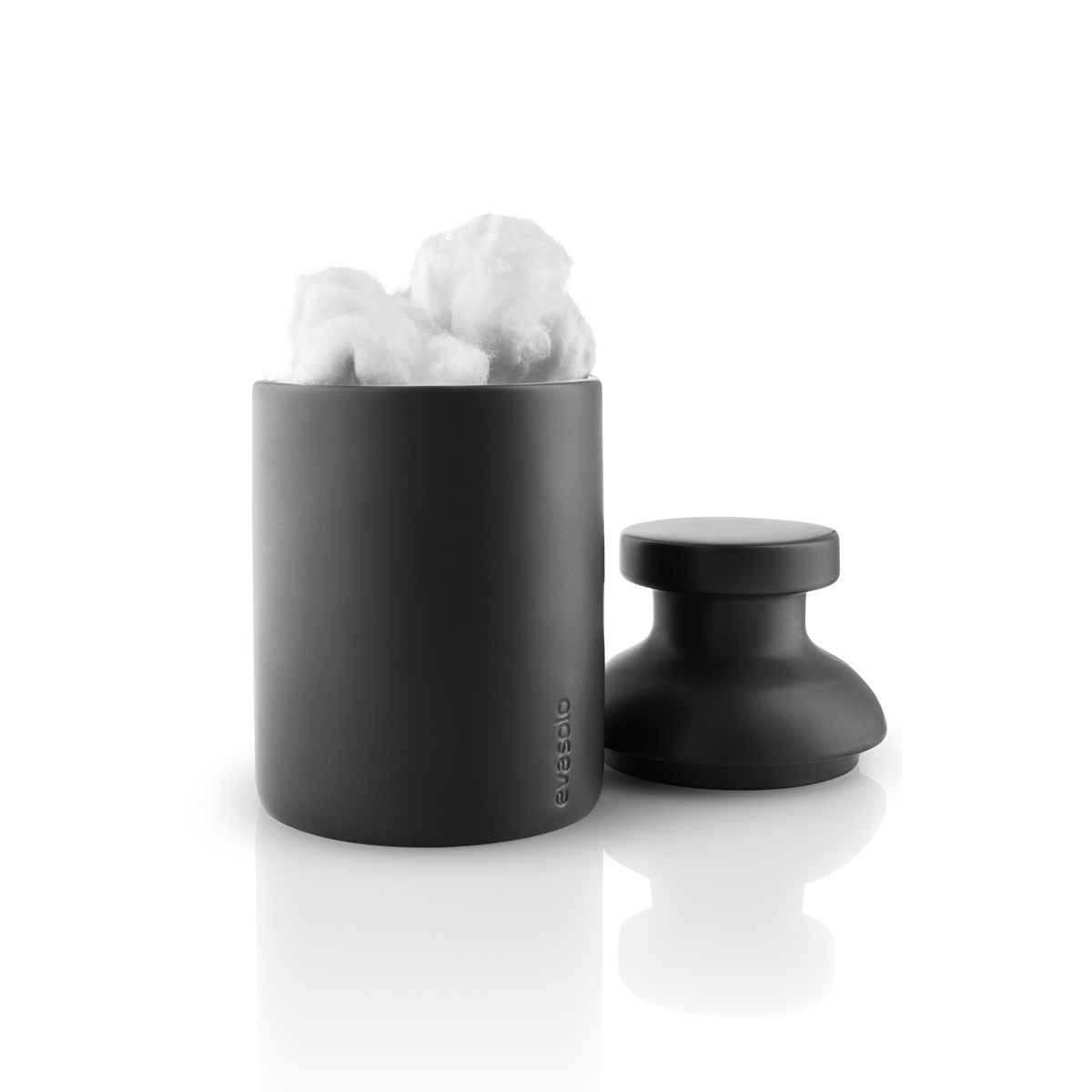 Voeg een vleugje stijl toe aan uw badkamer met de smaakvolle en praktische badkamerproducten van Eva Solo. Dit dekselpotje is perfect voor het opbergen van kleine dingen zoals wattenstaafjes, haarbanden of sieraden. Zowel het potje als het deksel zijn gemaakt van matzwart keramiek en roestvrij staal in een eenvoudig ontwerp, dat past bij de andere producten uit de Eva Solo badkamerserie zoals de tandenborstelhouder.