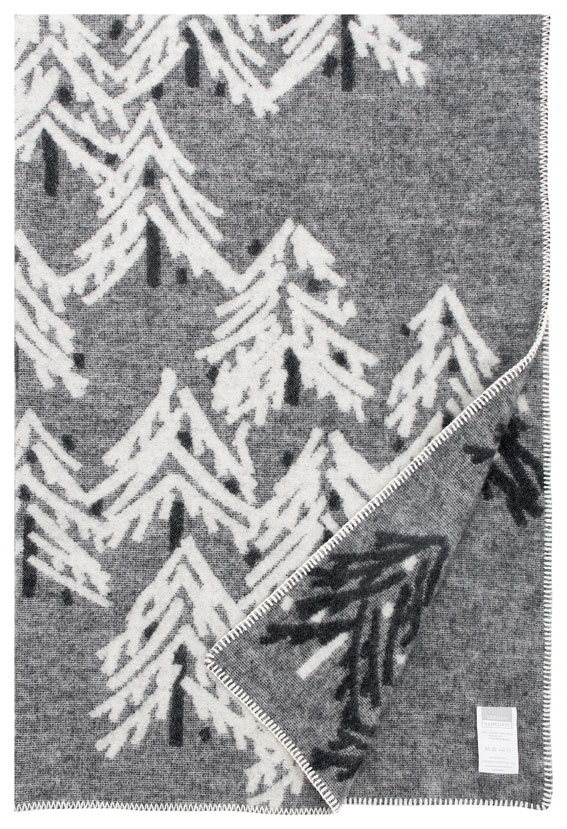 Mooie grijze wollen deken met het patroon van een Fins berkenbos. De plaid kun je dubbelzijdig gebruiken. Afmeting: 130 x 200 cm.