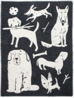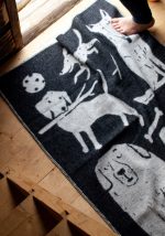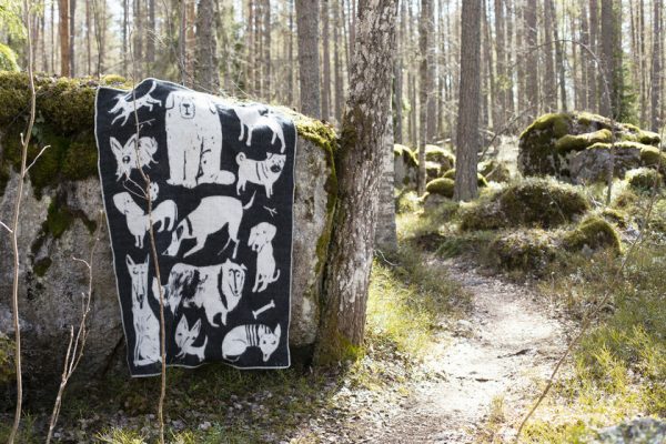 Leuke 100% wollen deken/plaid in kleurencombi zwart/wit met prent van vrolijke hondjes. Formaat 130 x 80 cm. Van het Finse merk Lapuan Kankurit, dat al sinds 1917 wollen dekens maakt! Lekker warm in de winter en koel in de zomer!