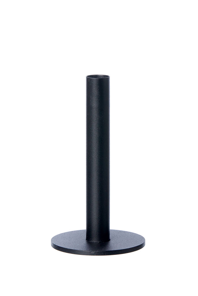 Lekker strak Deens design: deze zwarte kandelaar is gemaakt van gerecycled zwart gepoedercoat metaal. In 3 hoogten verkrijgbaar. Een standaard maat dinerkaars past altijd.