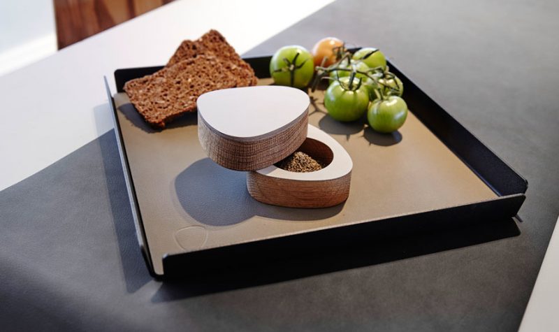 “Onze nummer één bestseller is de Curve placemat in gerecycled leer. Maar als het gaat om accessoires zien we dat onze Curve peper-en-zout set, bestaande uit twee delen – gemaakt van europees eikenhout, met een decoratief deksel er bovenop – het beste worden verkocht. Alle onderdelen van de peper-en-zout set zijn voorzien van een coating van gerecycled leer. Ze kunnen worden gedemonteerd en naar wens weer in elkaar gezet – verbonden door onzichtbare magneten.